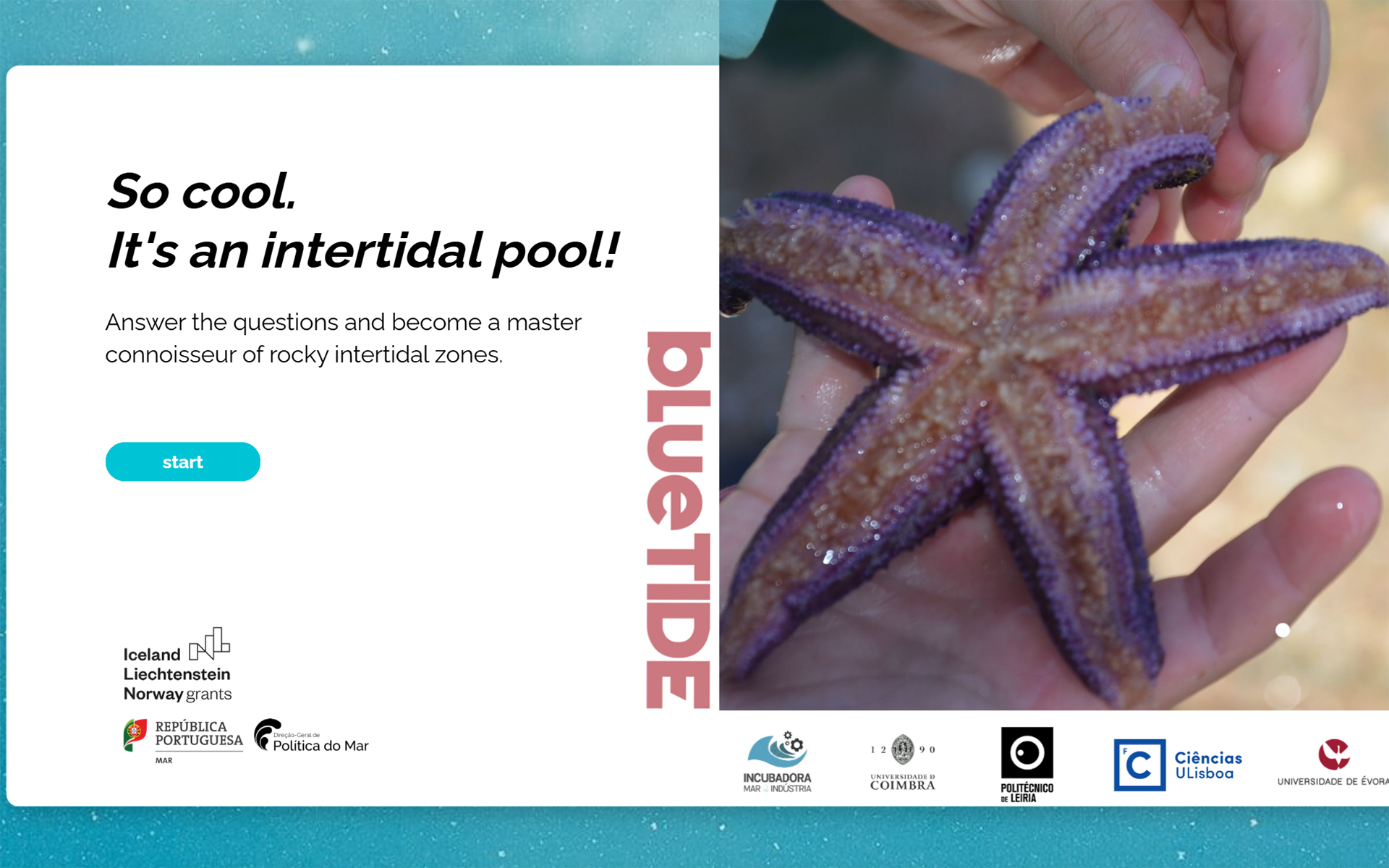 Quizz So cool! I’ts an Intertidal pool! Online Game Young people, Schools Start Here Test your knowledge of the rocky intertidal zone in this online quiz. Ideal for children between 8 and 13 years old. From the bLueTIDE project.